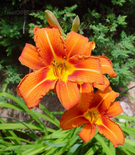 叶基生,条形,下面呈龙骨状突起。 蝎壳状聚伞圆锥状花序,花桔黄色或桔红色,无香味,具短花梗。
