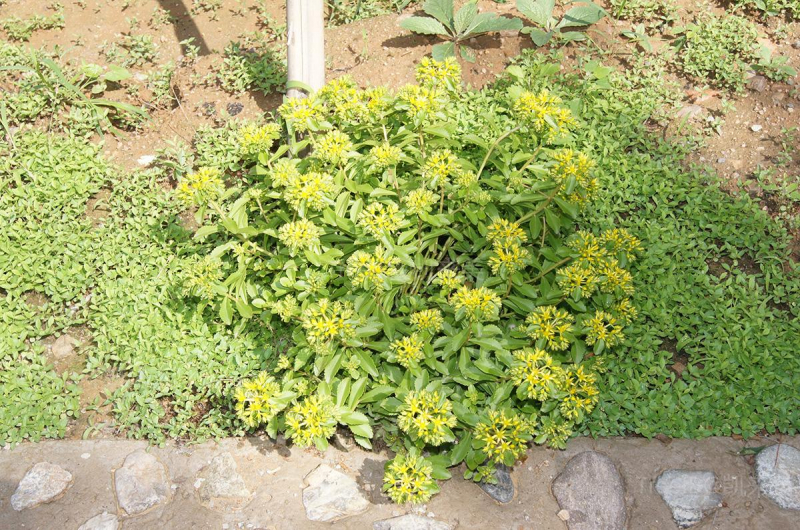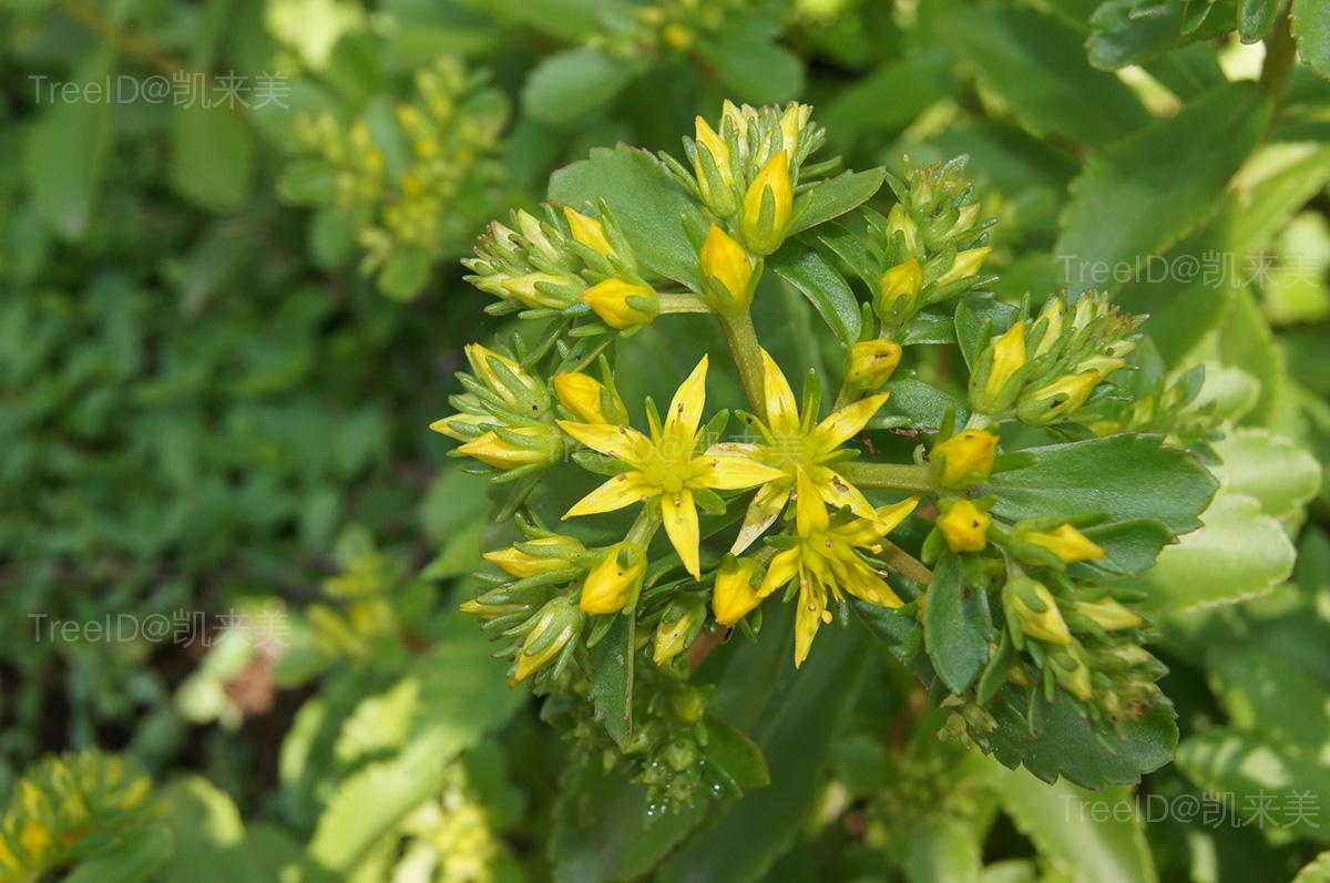 聚伞花序有多花,水平分枝,平展,下托以苞叶。萼片5,线形,肉质,不等长,长3-5毫米,先端钝;花瓣5,黄色,长圆形至椭圆状披针形,长6-10毫米,有短尖;雄蕊10,较花瓣短;鳞片5,近正方形,长0.3毫米,心皮5,卵状长圆形,基部合生,腹面凸出,花柱长钻形。