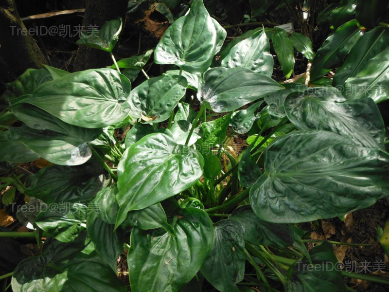 地上茎圆柱形,黑褐色,具环形叶痕。叶柄绿色,叶片膜质至亚革质,深绿色,宽卵状心形。花序柄圆柱形,稍粗壮,常单生,佛焰苞近肉质,管部长圆状卵形,淡绿至深绿色,肉穗花序比佛焰苞短,雄花序近纺锤形,苍黄色或黄色。浆果近球形。