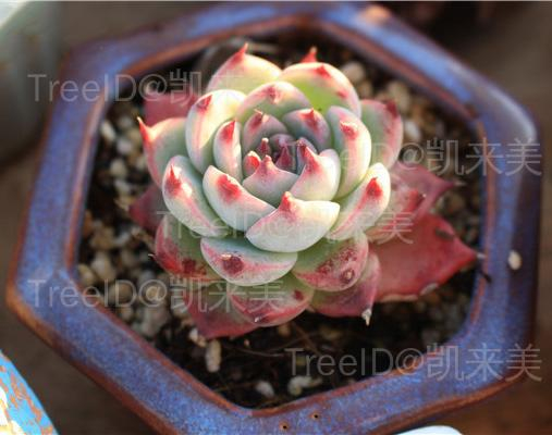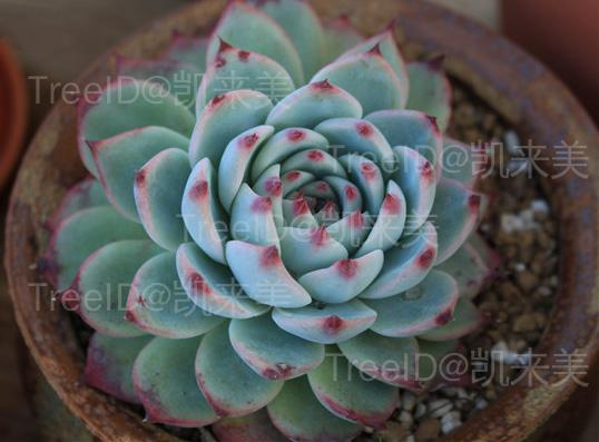 株型小巧,叶倒卵形,被白粉,肉质,面光滑,呈莲座状排列,具短叶尖,蓝绿色,叶尖和叶缘在阳光充足的环境中呈桃红色。春季开花,穗状花序,花倒钟型,花瓣4-5出,黄红色。