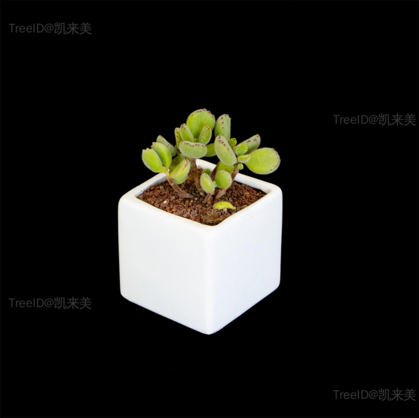 植株多分枝,茎绿色,肉质叶肥厚,交互对生,卵圆形,绿色,密生白色短毛。叶端具红色爪样齿,二歧聚伞花序,小花黄色。