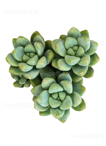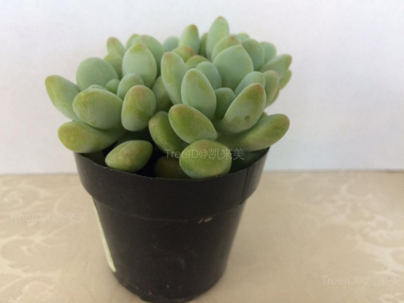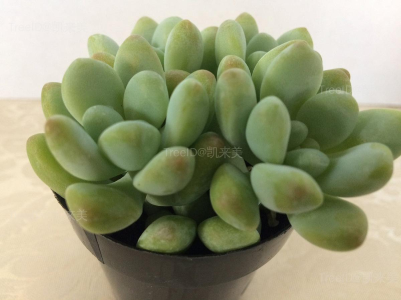 叶片卵形带有白粉,叶面光滑,叶背凸起弧度非常圆润,叶尾明显膨胀,叶子环生于枝干上,顶端生长点的叶子紧凑排列,看上去十分萌。枝条可不断向上生长,天使之泪枝干下部容易萌生侧芽,形成分支。