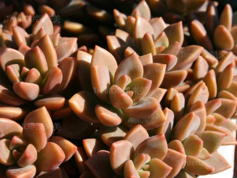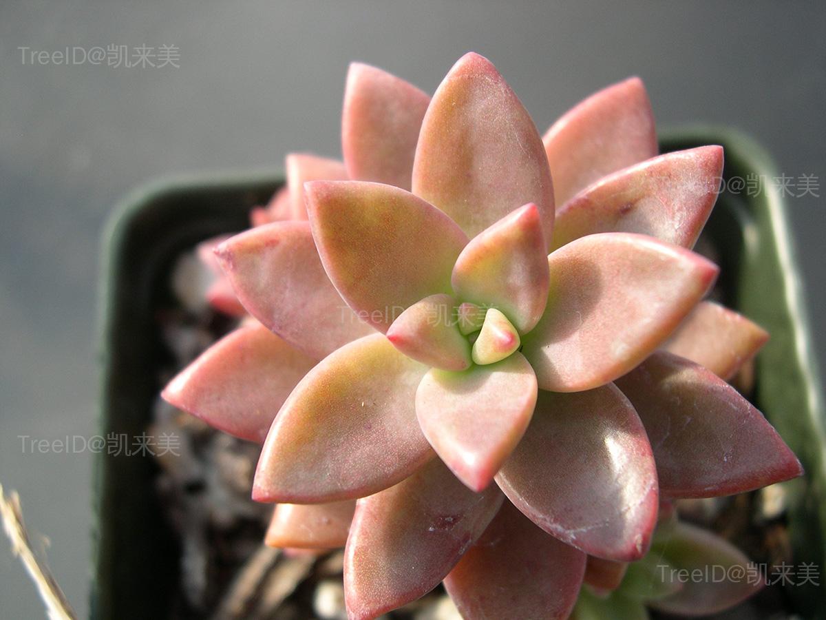 花瓣被蜡,叶排成延长的莲座状被白粉。平时为绿色,日照充足时叶色为朱红带褐色,叶呈瓜子型,叶末较尖。