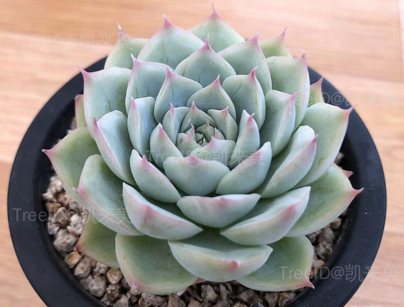 植株莲座状,叶片卵形、肥厚,叶正面略凹,叶背圆弧状凸起,叶前端急尖,叶色粉青,叶缘红边明显。