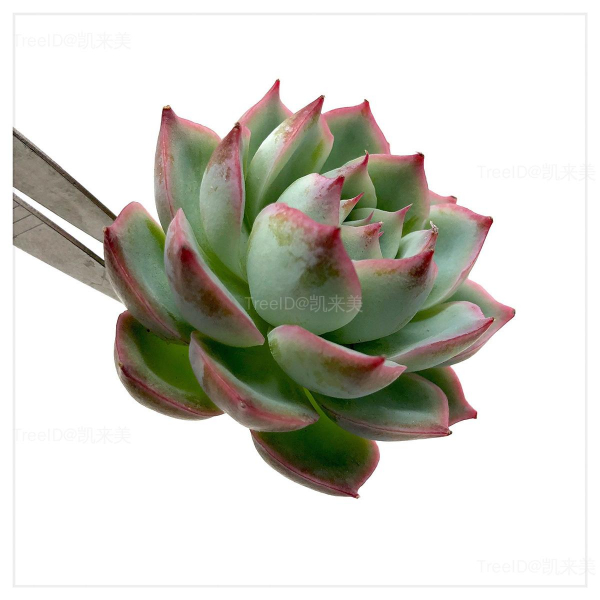 叶片卵形、肥厚,叶正面略凹,叶背圆弧状凸起,叶前端急尖,叶色粉青,叶缘红边明显,植株整体有月影系的通透感。