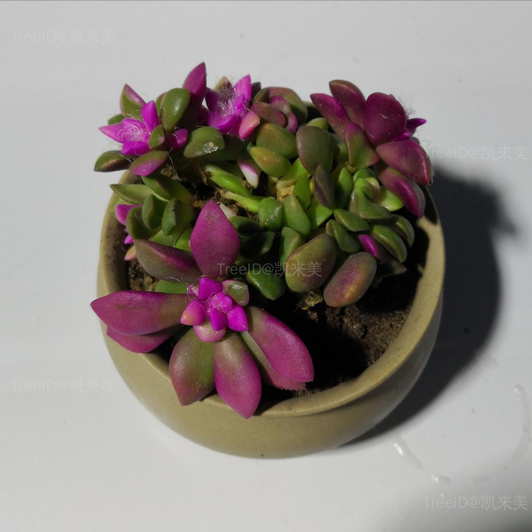 叶片嫩绿似翡翠,茎部叶腋间生长出白色丝毛,如同蜘蛛网状。顶端叶片似莲花展开,叶面厚实。花单生,淡粉红色,仅在阳光下开花。