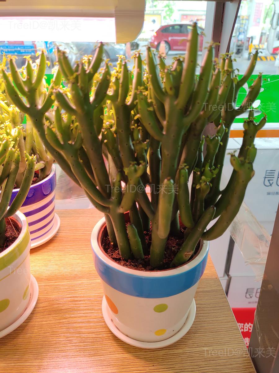 绿珊瑚变异后形成的植株,它的形态较为修长,呈嫩绿色,茎干上长有黑色小点。