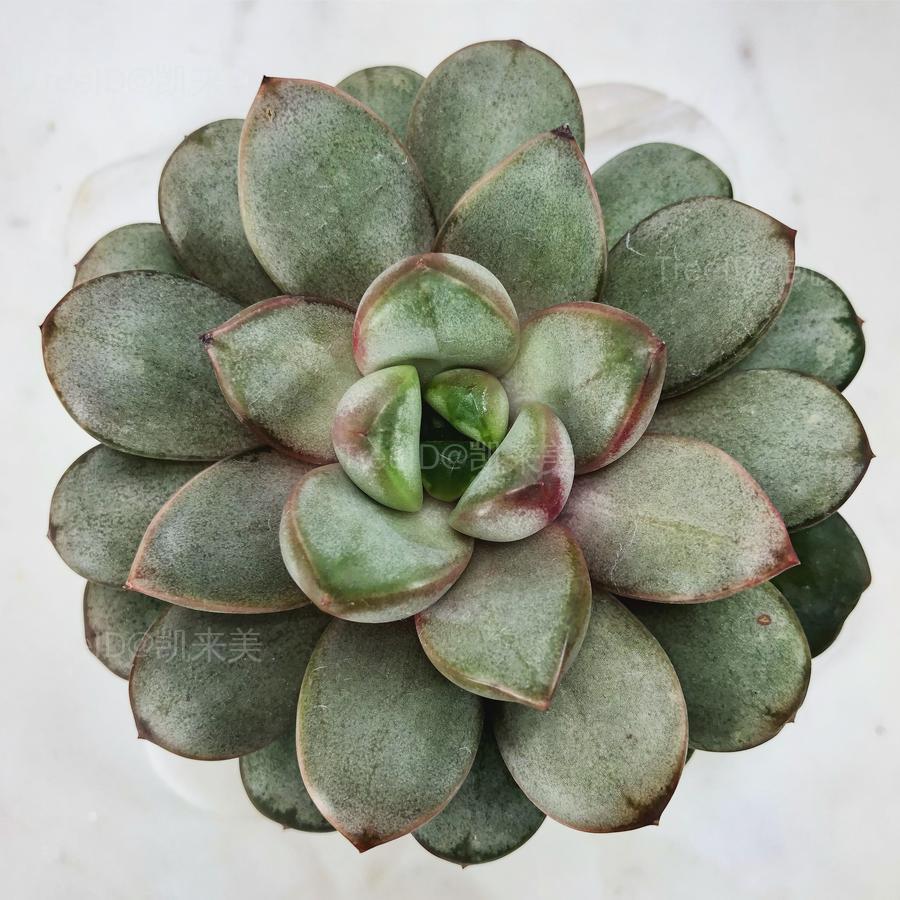 多年生肉质草本,中小型品种,葡萄易从基部萌生匍匐茎,半匍匐于土表,茎顶端有小莲座叶丛。肉质叶呈莲座状排列,叶短匙形,叶面平,叶背凸起有紫红色密集小点点,叶片先端有小尖,叶色浅灰绿或浅蓝绿,叶面光滑有蜡质层,不怕水。葡萄聚伞花序腋生,花开倒钟型,前端5裂。红色,顶端为黄色。