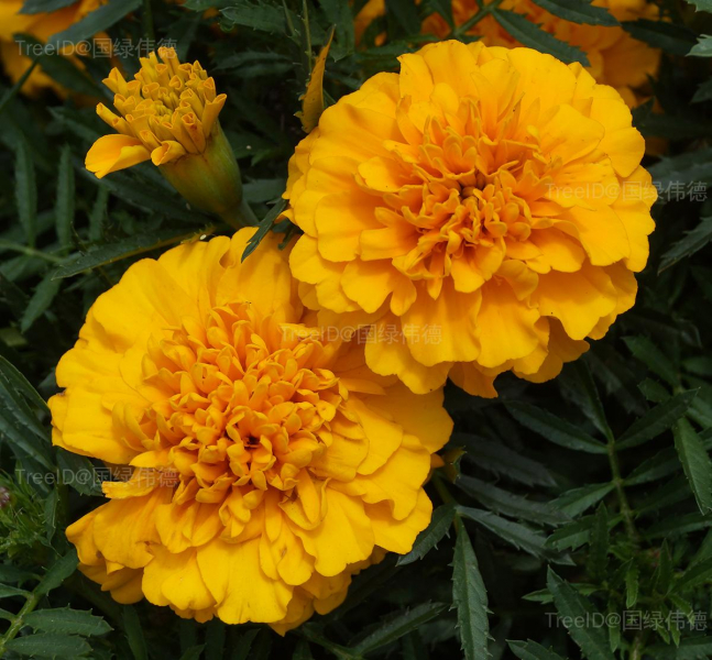 万寿菊是一种常见的园林绿化花卉,其花大、花期长,常用来点缀花坛、广场、布置花丛、花境和培植花篱。中、矮生品种适宜作花坛、花径、花丛材料,也可作盆栽;植株较高的品种可作为背景材料或切花。