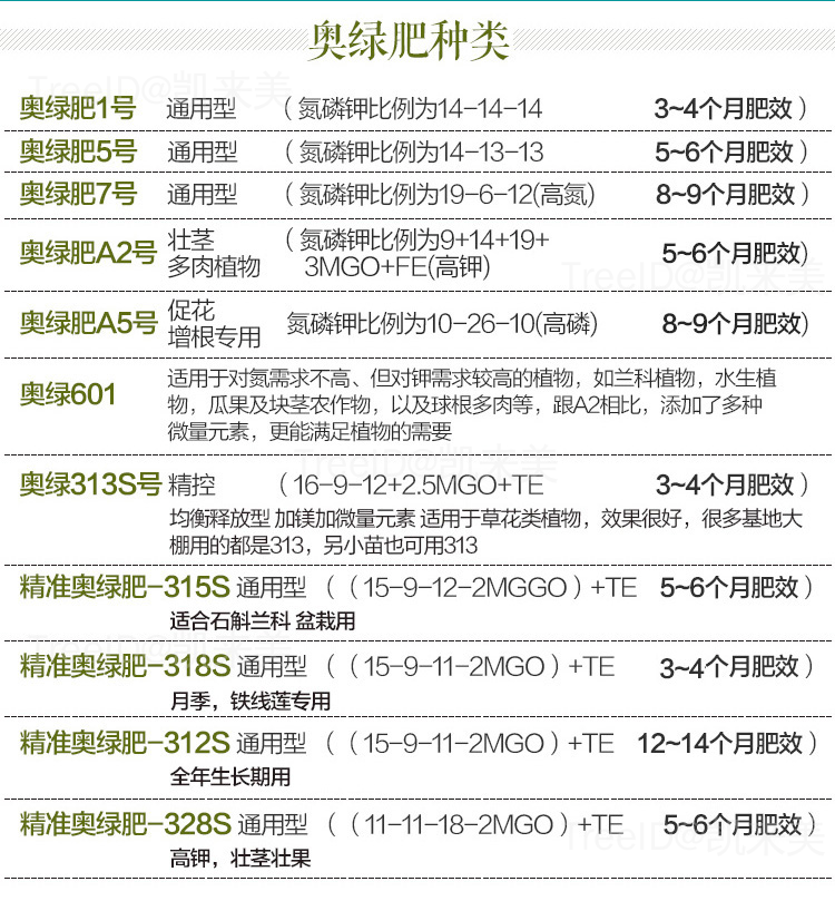奥绿缓释肥有很多种型号,不同型号对应不同的养分比例及微量元素,且释放周期也有所不同。