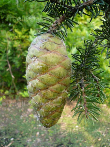 球果矩圆状圆柱形或卵状圆柱形,长8-14厘米,径宽5-6.5厘米,成熟时淡褐色或褐色;种鳞宽大;苞鳞短小。