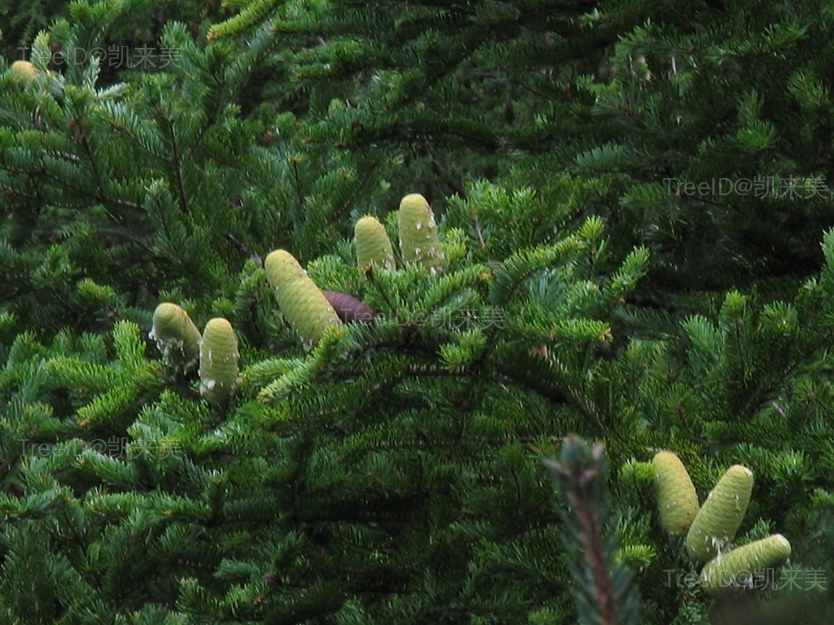 球果圆柱形或卵状圆柱形,长7-11厘米,径3-4厘米,近无梗,成熟前绿色,熟时褐色,种鳞背部露出部分密生短毛;苞鳞不外露。