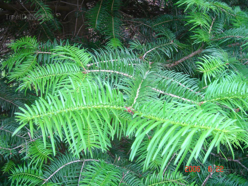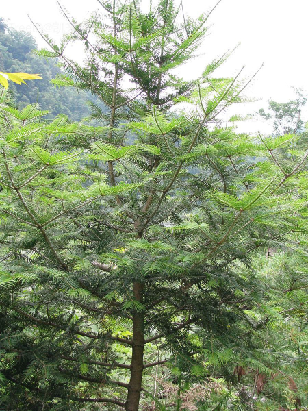 小枝淡黄灰色至淡褐黄色。枝条下面的叶排成两列;叶扁平条形,长1.5-4.8厘米,先端有凹缺,背面有2条白色气孔带。球果直立,圆柱形或卵状圆柱形,长7-11厘米,径3-4厘米,熟时褐色。