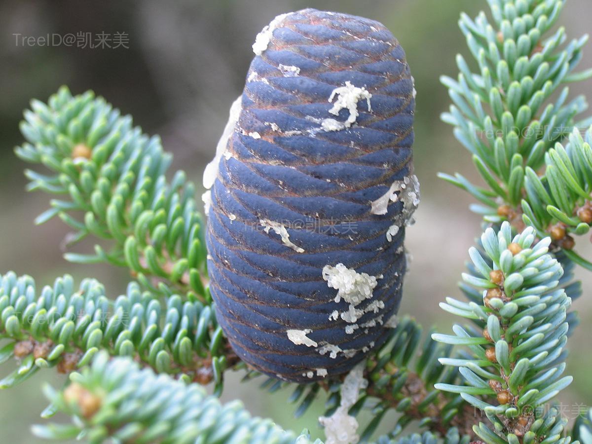 球果椭圆状卵形或圆柱状卵形,长4-8厘米,径3-4厘米,近无梗,成熟前紫色,熟时紫褐色;中部种鳞肾形、扇状横椭圆形,或菱状横椭圆形,长1.2-1.4厘米,宽1.2-2.5厘米,上部宽圆较薄,边缘微向内曲,中部楔状,稀微缩而两侧突出,下部耳形、明显或不明显,基部渐窄成短柄状;苞鳞不露出,长达种鳞的1/2-3/4, 上部宽圆,边缘有细缺齿,先端有急尖的短尖头,尖头明显或不明显,苞鳞背部无纵脊或有不明显的纵脊,中部收缩;种子倒卵状斜方形,长约8毫米,种翅淡黑褐色或黑色,较种子为短,先端平截,宽6-9毫米,连同种子长1.1-1.3厘米。