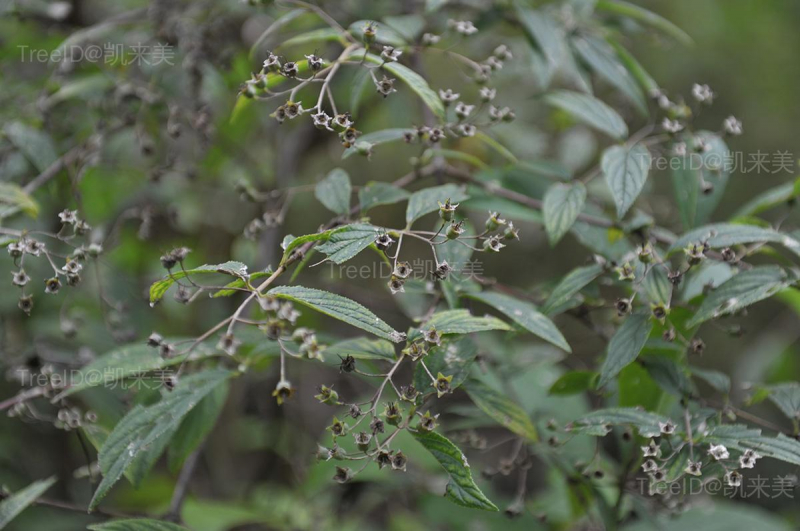 聚伞花序长6-10厘米,有花12-20多朵;花冠直径1.5-2厘米;萼筒杯状,密被星状毛;花瓣白色,椭圆形,长10-12毫米。