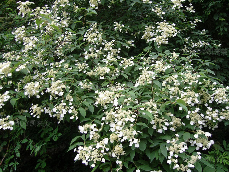 伞房状聚伞花序直径8-15厘米;不育花萼片4;花瓣白色,长2.5-3毫米。