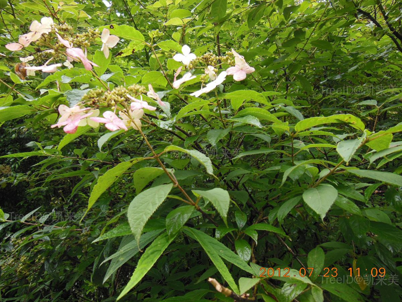 单叶对生,长卵形至矩圆状倒卵形,长7-16厘米,边缘有锯齿,叶背密被细柔毛或变无毛。伞房状聚伞花序;周边花为大型放射状不孕花,花瓣状萼片4,无花瓣;中间花为小型两性花,白色,花瓣5。蒴果近卵球形。