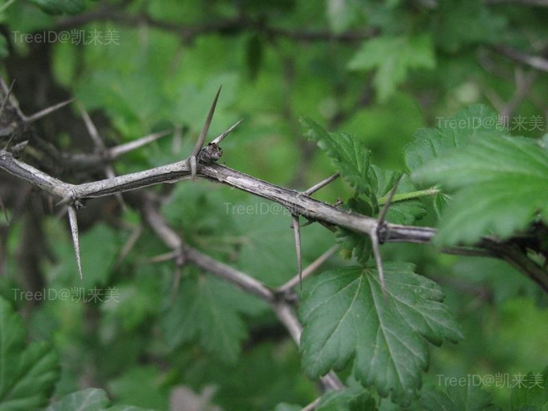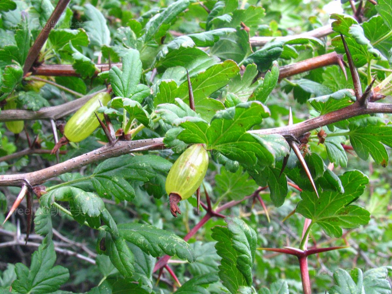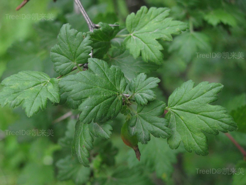 枝具三叉状长刺。叶近圆形或宽卵圆形,基部截形至近心脏形,掌状3-5裂,裂片边缘具粗钝锯齿。2-3花组成短总状花序或花单生于叶腋;花萼浅绿色或绿褐色;花瓣长圆形,白色。浆果长圆形,浅绿色有红晕或红色,无毛。