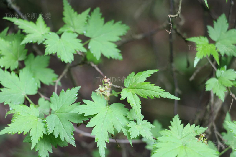叶长卵圆形,长2-5.5厘米,宽2-5厘米,基部截形至心脏形,掌状3-5裂,顶生裂片菱状卵圆形,先端渐尖至尾尖,比侧生裂片长1-2倍,边缘具深裂或缺刻状重锯齿;叶柄长1-3厘米。