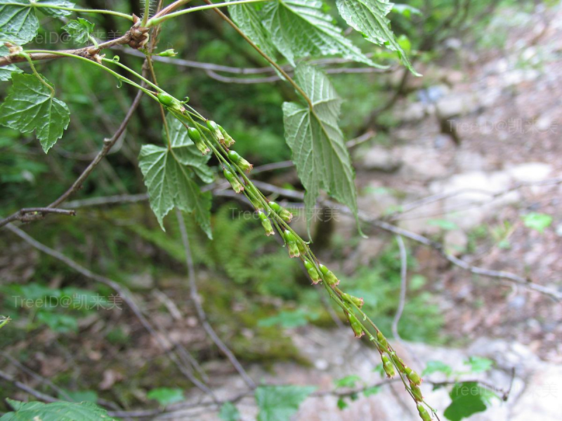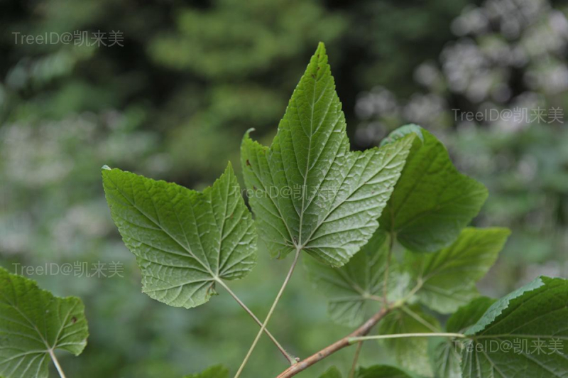 叶卵圆形,长5-12厘米,宽几与长相似,基部深心形,两面无毛,掌状3裂,裂片卵圆形,顶生裂片长于侧生裂片,边缘具不整齐粗锯齿;叶柄长4.5-8厘米。