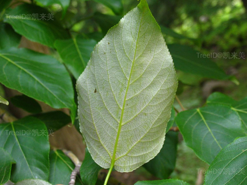 叶卵形或宽卵形,长7-14厘米,宽4-9厘米,先端渐尖,基部圆形或近心形,边缘细锯齿或圆锯齿,齿端有腺点,具缘毛;叶柄圆柱形,长2-5厘米。