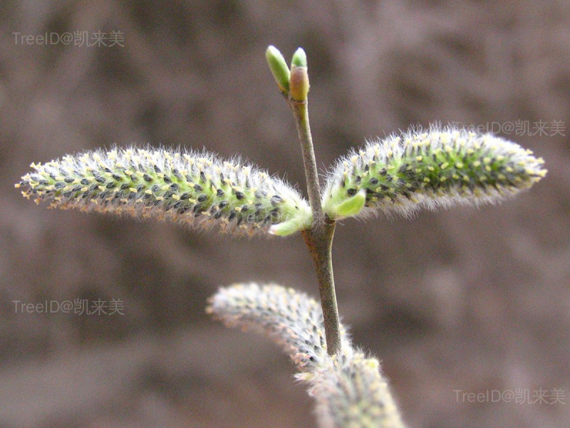 花先叶开放,花序圆柱形,长2-3厘米,粗约5-6毫米,对生或互生,无花序梗,基部具2-3枚下面密被长毛的椭圆形鳞片;苞片卵形,先端钝或微尖,黑色,两面有长柔毛;腺体1,腹生;雄蕊2,花丝合生,纤细,无毛,花药4室,圆形,黄色或淡红色;子房卵形,密被灰绒毛,柄短,花柱长0.1-0.2毫米,柱头头状。