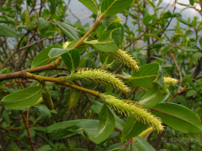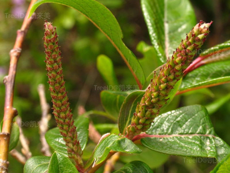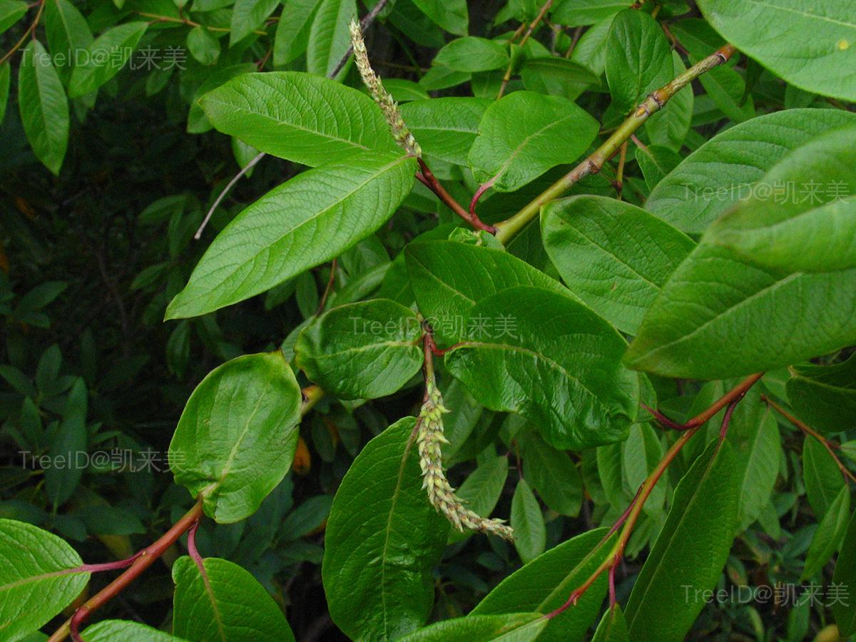 叶倒卵状长圆形,狭倒卵状椭圆形,长4-9厘米,下面苍白色或有白粉,边缘有不规则的细锯齿,稀近全缘。花序梗明显,具有2-4个正常叶;雌花序轴被长柔毛。蒴果卵状长圆形,密被灰白色柔毛,无柄或具短柄。