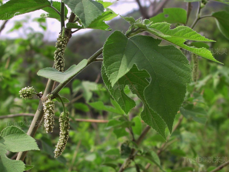 叶宽卵形至矩圆状卵形,不分裂或不规则的3-5深裂,边缘有粗锯齿,上面有糙毛,下面密生柔毛,三出脉。花单性,雌雄异株;雄花序葇荑状;雌花序头状。聚花果球形,肉质,红色。