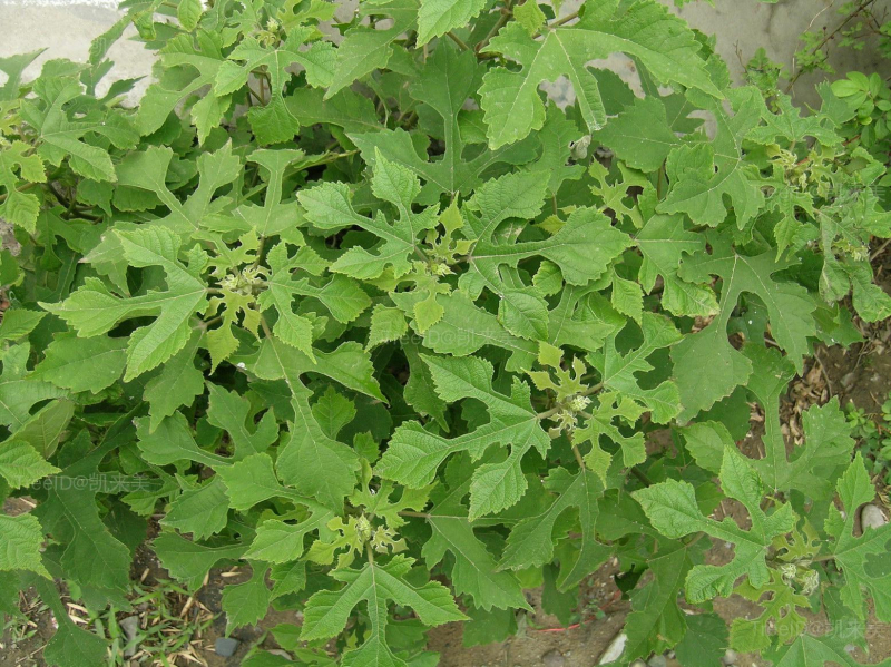 叶螺旋状排列,广卵形至长椭圆状卵形,长6-18厘米,宽5-9厘米,先端渐尖,基部心形,边缘具粗锯齿,不分裂或3-5裂,小树之叶常有明显分裂,表面粗糙,疏生糙毛,背面密被绒毛, 基生叶脉三出;叶柄长密被糙毛;托叶大,卵形。