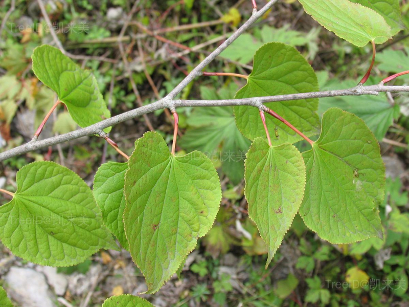 叶片卵状心形,长7-15厘米,宽4-11厘米,顶端渐尖,基部心形,边缘具细锯齿,齿端具腺点,掌状脉5-7。