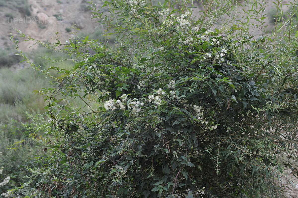 三出复叶;小叶片卵形或宽卵形,长5-13厘米,宽3-9厘米,通常下面密生短柔毛,边缘有少数钝牙齿。圆锥状聚伞花序多花;花直径约1.5厘米;萼片4,白色。瘦果纺锤形或狭卵形,宿存花柱长约1.5厘米。