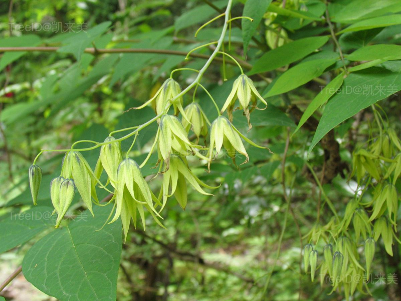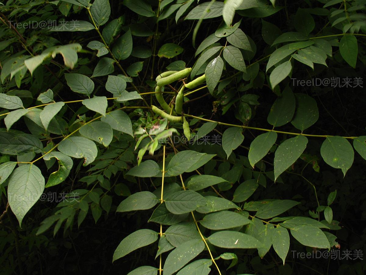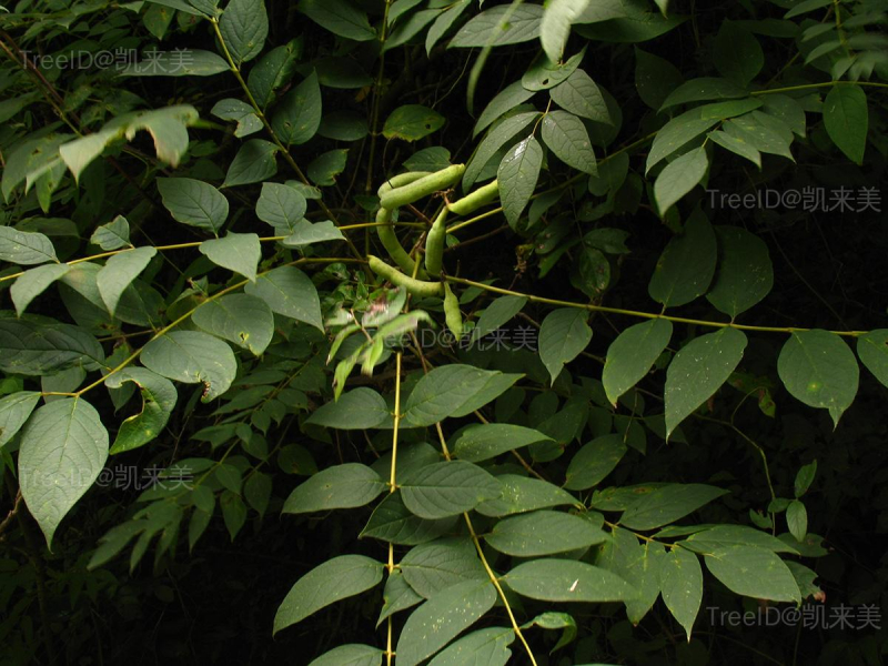 羽状复叶,小叶13-25片;小叶膜质,卵形至卵状长圆形。总状花序腋生,或数个再复合为疏松、下垂顶生的圆锥花序;花杂性。果下垂,圆柱形,蓝色,长5-10厘米。