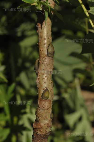 羽状复叶长50-80厘米,有小叶13-25片;叶柄长10-20厘米;小叶卵形至卵状长圆形,长6-14厘米,宽3-7厘米,先端渐尖或尾状渐尖,基部圆或阔楔形。