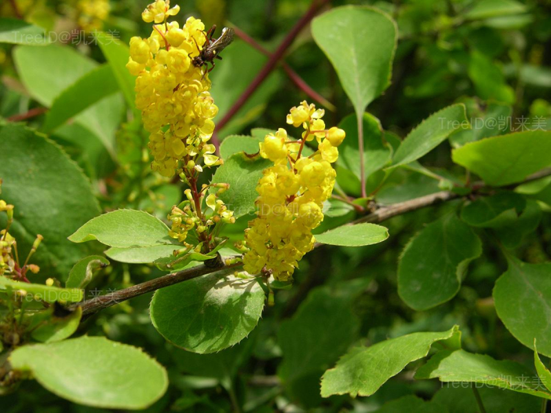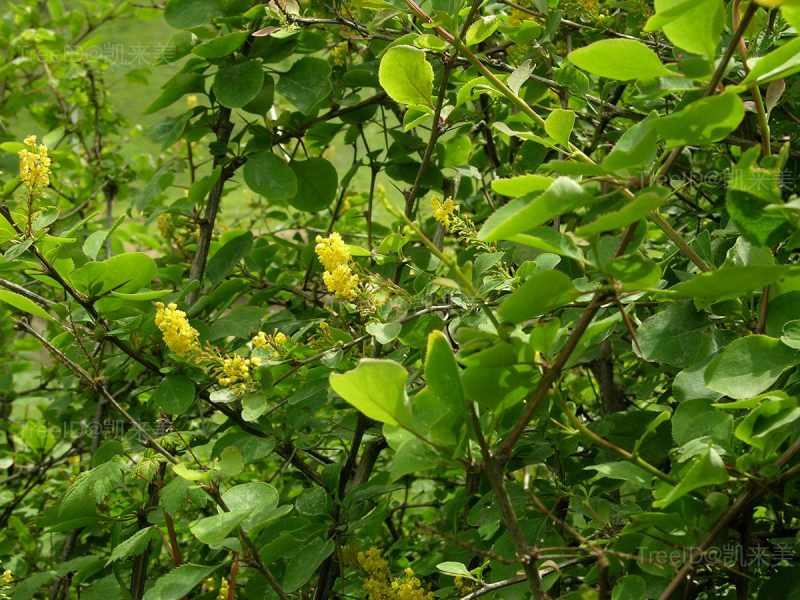 叶长圆状椭圆形、宽椭圆形或近圆形,长3-6厘米,宽2.5-4厘米,叶缘具细小刺齿。总状花序直立,具15-30朵花;花黄色。浆果椭圆形,红色。