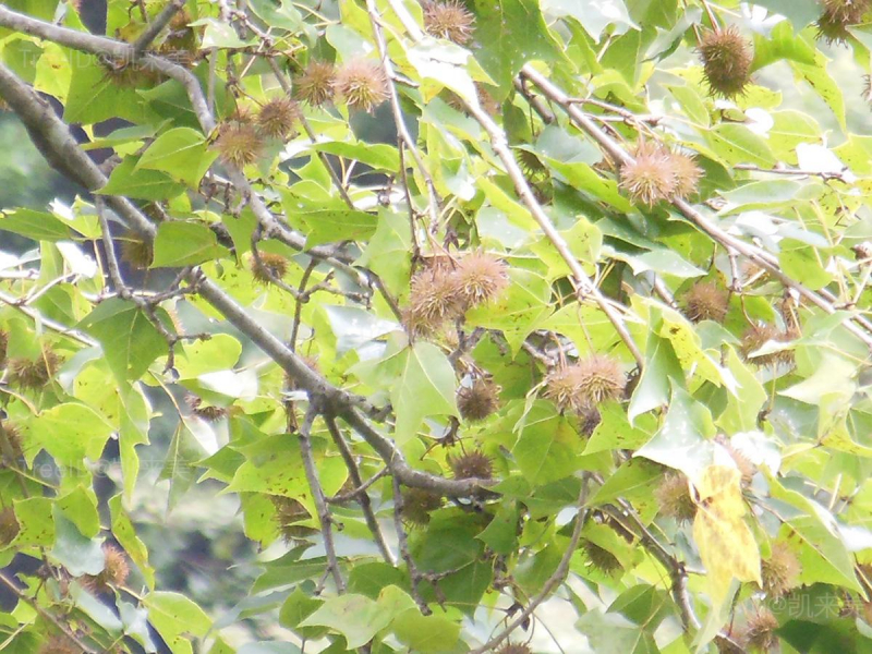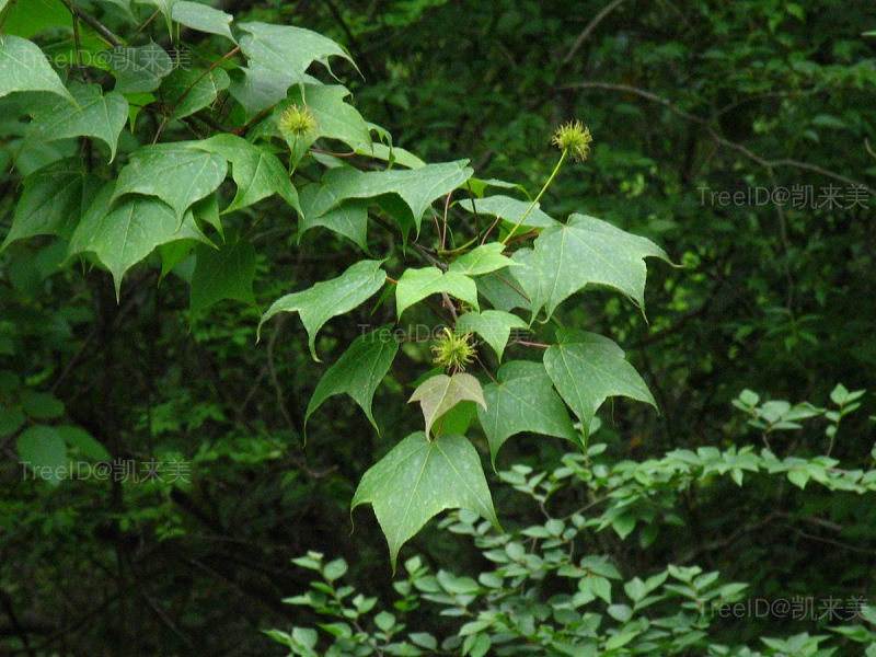 叶宽卵形,掌状3裂,中裂片较长,两侧裂片平展,基部心形;掌状脉3-5条;叶柄长达11厘米;托叶红色,条形,早落。花单性,雌雄同株,无花被;雄花排列成葇荑花序;雌花25-40,排列成头状花序;萼齿5,钻形,花后增长。头状果序圆球形,宿存花柱和萼齿针刺伏。