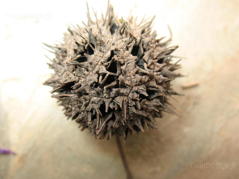 头状果序圆球形,木质;蒴果下半部藏于花序轴内,有宿存花柱及针刺状萼齿。