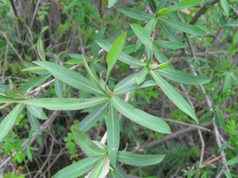 叶互生,在老枝上丛生,线状披针形,长4-6.5厘米,宽1-2.3厘米,全缘,无毛,中脉明显。