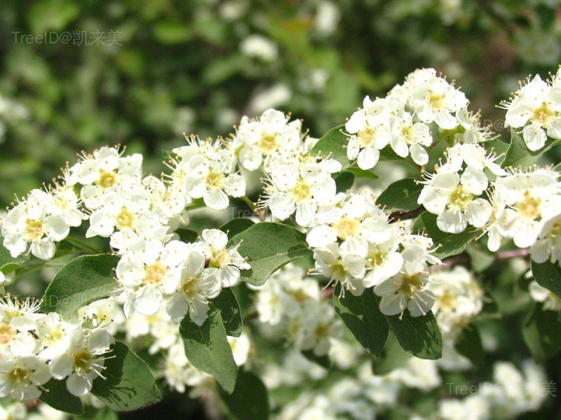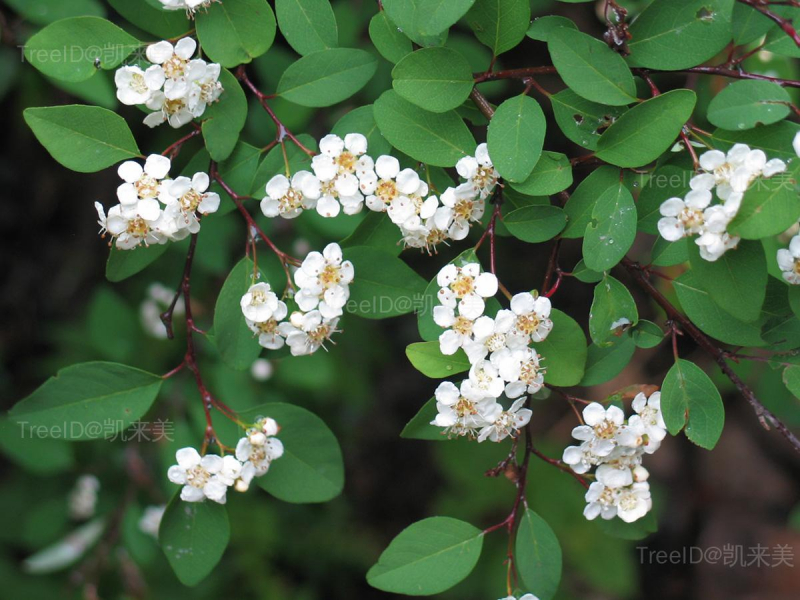 叶片卵形。聚伞花序有花6-21朵;花瓣白色,平展,近圆形。梨果近球形或倒卵形,红色;有1小核。