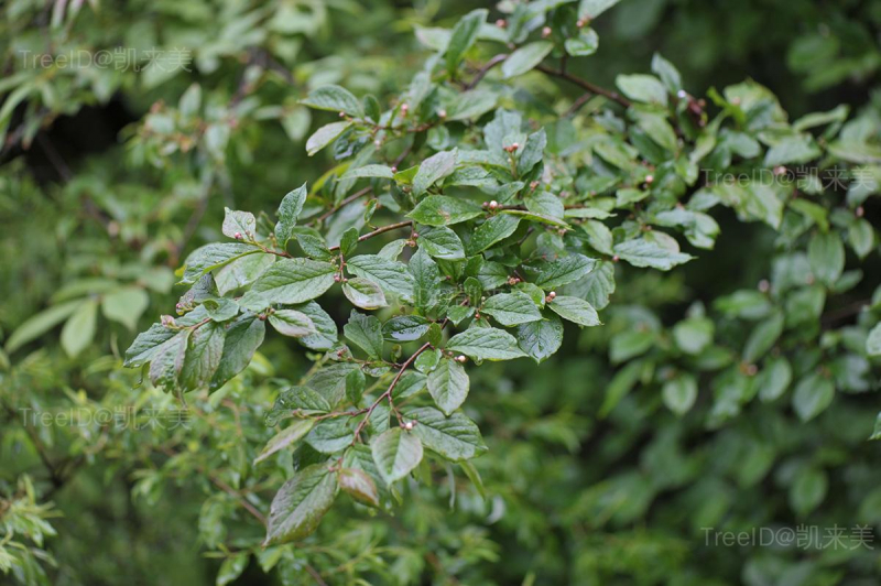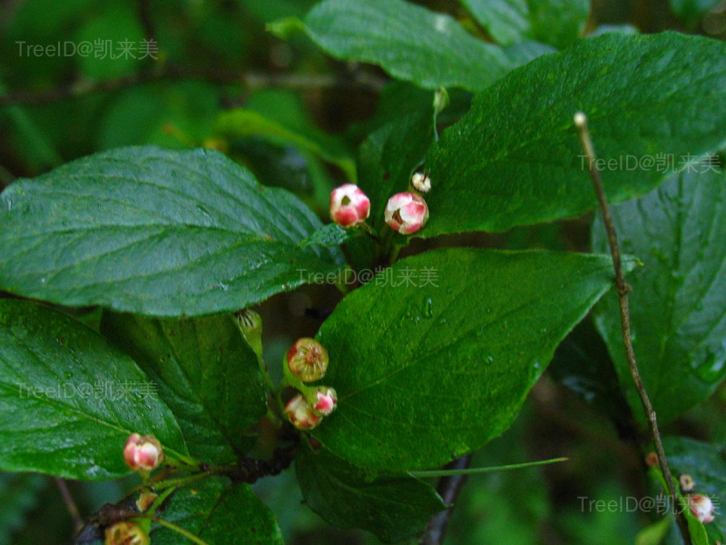 叶片椭圆卵形至菱状卵形,长2.5-6厘米,宽1.5-3厘米,全缘,下面具柔毛。聚伞花序有花5-10朵;花瓣直立,宽卵形或近圆形,白色带粉红。果实卵形或近球形,黑色,常具2-3小核。