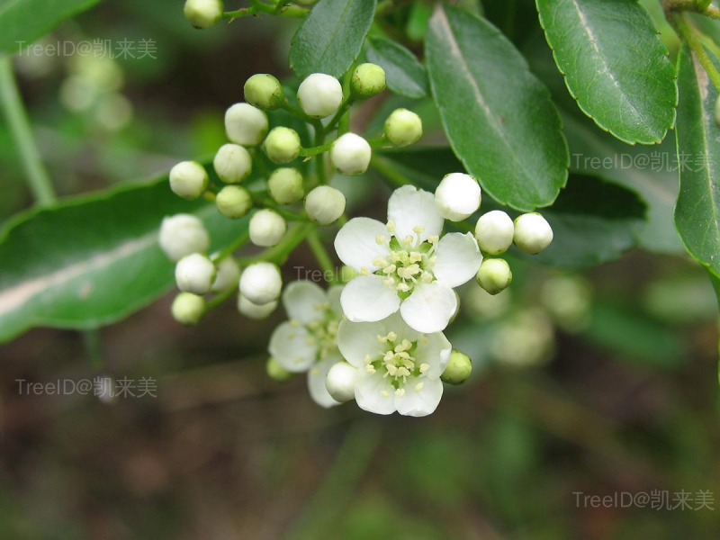 叶片倒卵形,薄革质,长1.5-6厘米,宽0.5-2厘米,先端圆钝,边缘有钝锯齿;叶柄短。多花集成复伞房花序,直径3-4厘米;花瓣白色。梨果近球形,桔红色至深红色。
