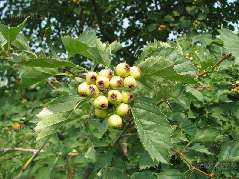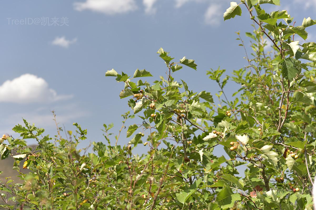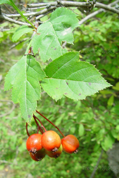 叶片宽卵形,边缘有 2-3 对浅裂片,裂片锯齿尖锐不整齐;叶柄密被柔毛。复伞房花序多花,总花梗和花梗密被柔毛;花瓣近圆形,白色。梨果幼时长圆卵形,熟时近球形,桔红色;具2-3骨质小核。