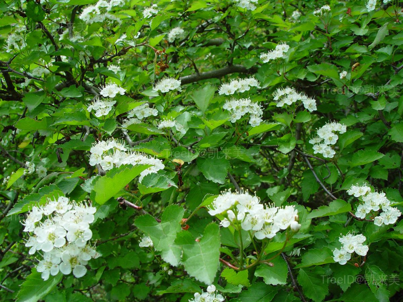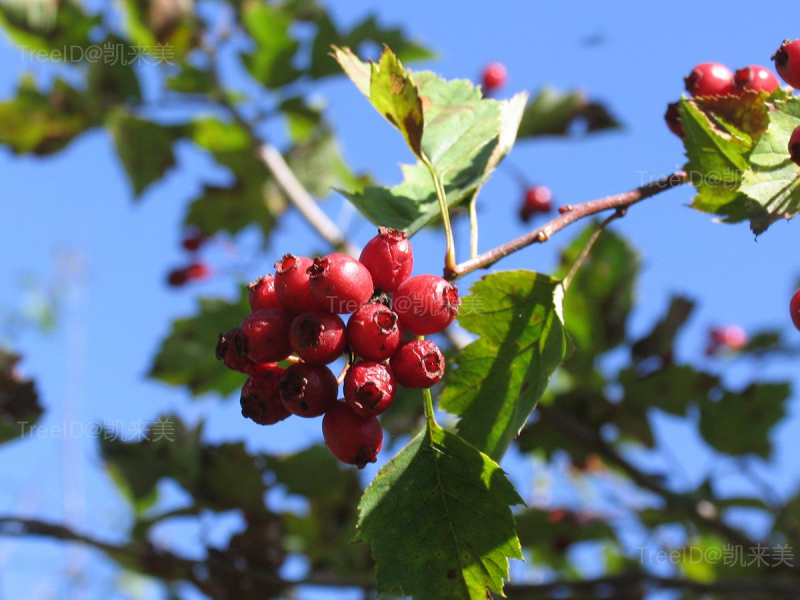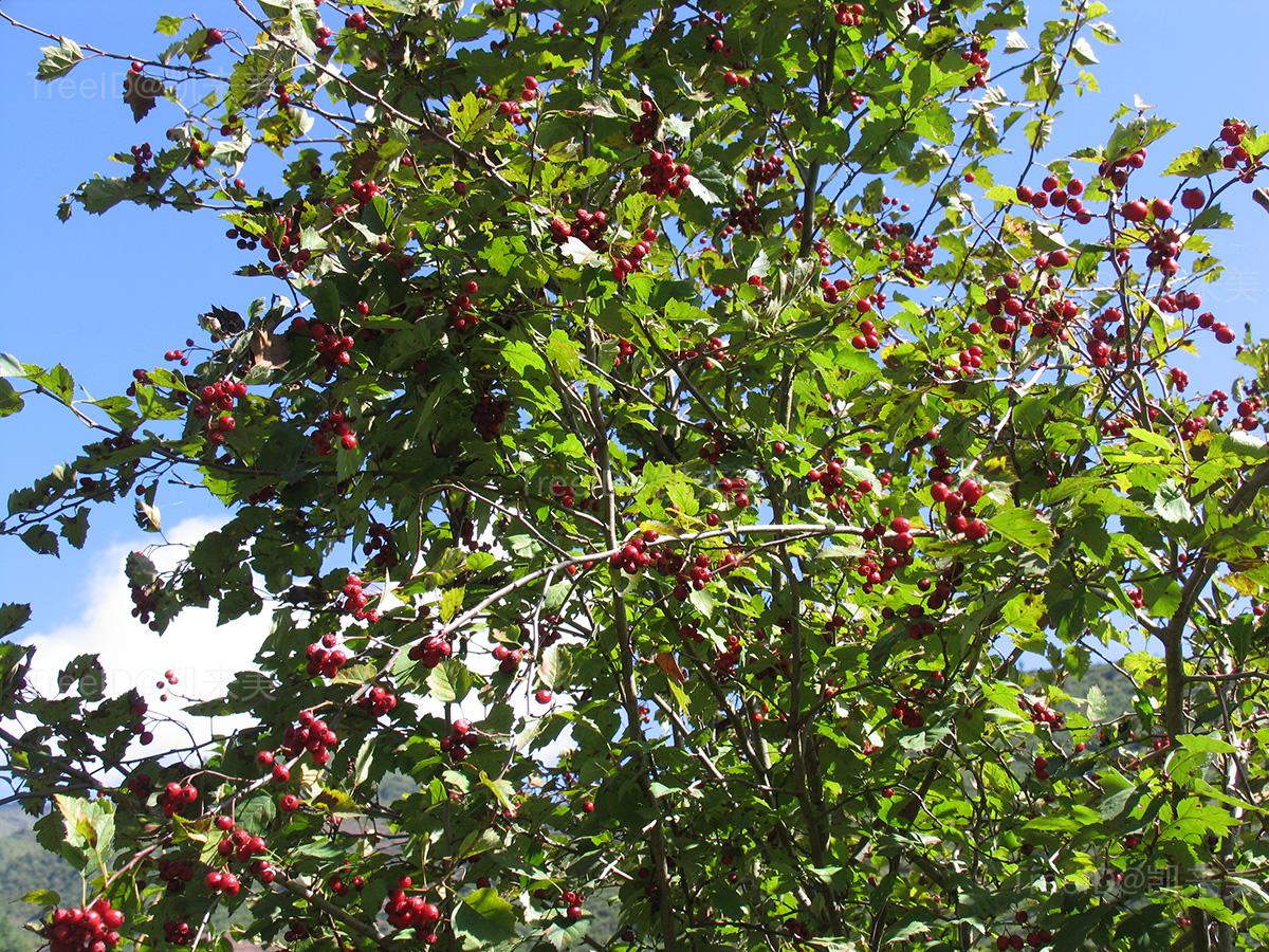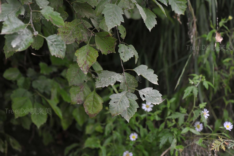 叶片宽卵形,边缘有尖锐重锯齿和 5-7对不规则羽状浅裂片,裂片三角卵形。伞房花序具花8-18 朵,无毛;花瓣近圆形,白色。梨果熟时近球形,红色或桔黄色;具2-3骨质小核。