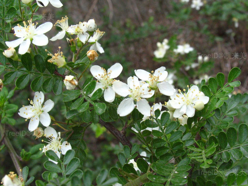奇数羽状复叶具小叶7-15,小叶椭圆形,长3-10毫米,全缘,近无柄。顶生伞房花序直径2-3厘米,有3-5朵花;总花梗和花梗均密被灰白色柔毛;花白色,直径约1厘米。果实近球形,蓝黑色。