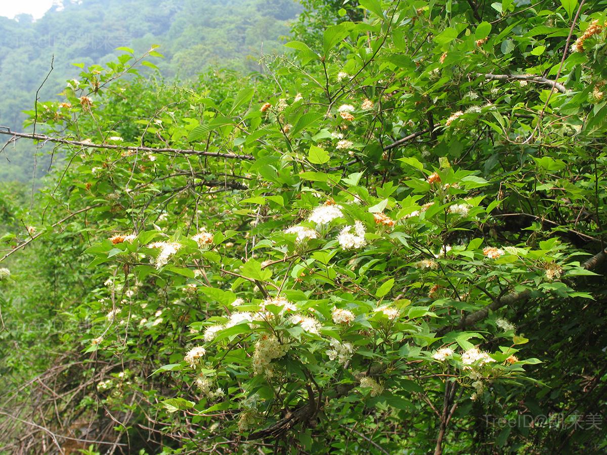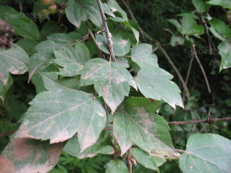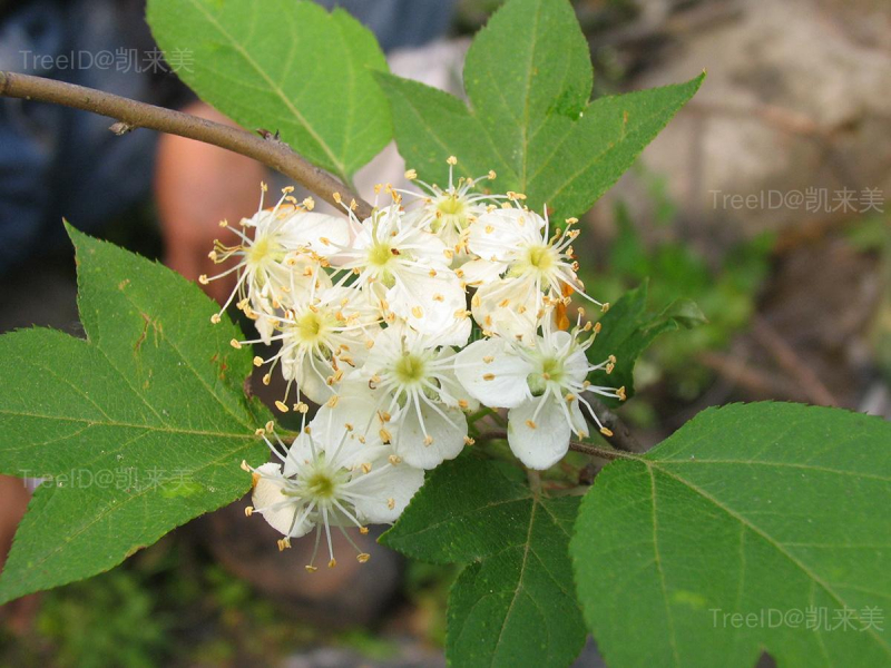 叶片卵形,长5-8厘米,通常3浅裂,裂片三角卵形,边缘有细锐重锯齿。伞形总状花序具花4-10朵;花白色。梨果椭圆球形,黄红色,萼片脱落。