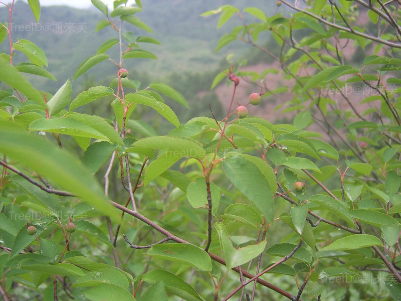 叶片卵形,长4-7厘米,除基部外有细锐锯齿;叶柄细。总状花序顶生;花白色,直径3-4.5厘米;花瓣狭长。果实近球形,蓝黑色。
