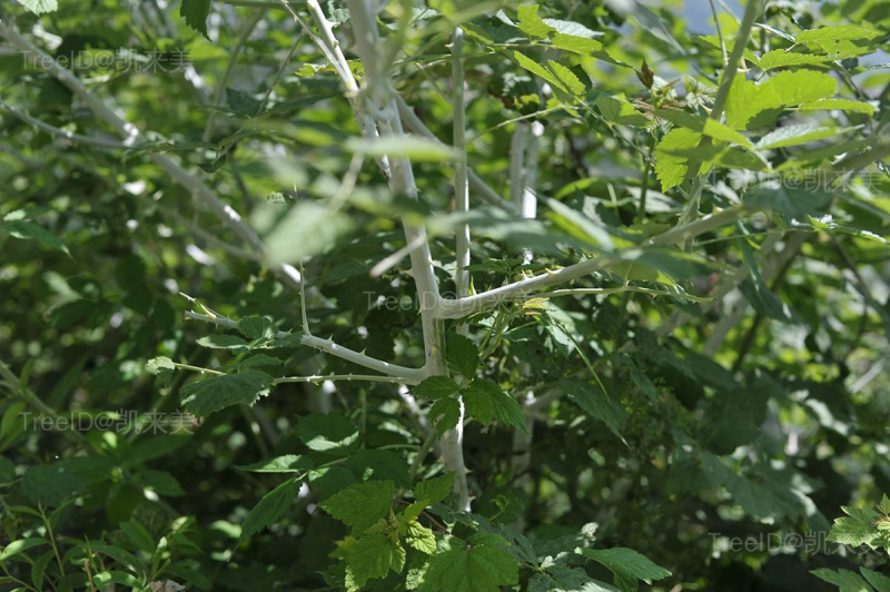枝褐色,无毛,具白粉霜,疏生粗壮钩状皮刺。