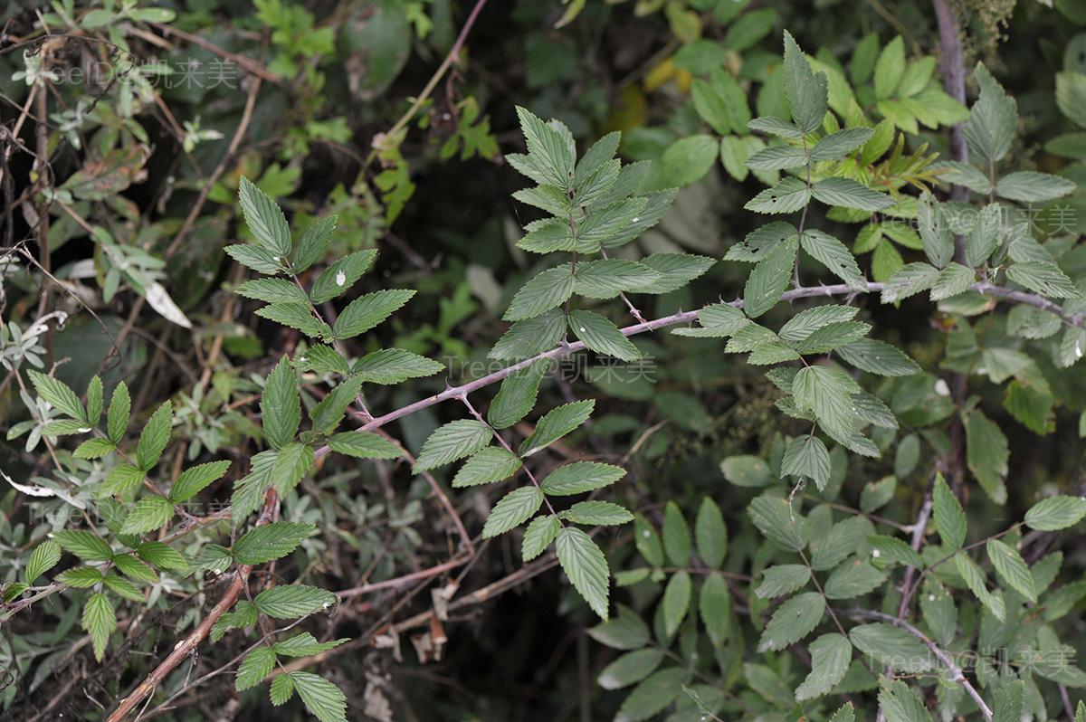 枝常紫红色,被白粉,疏生钩状皮刺。