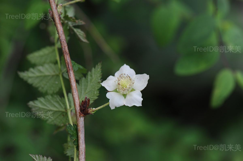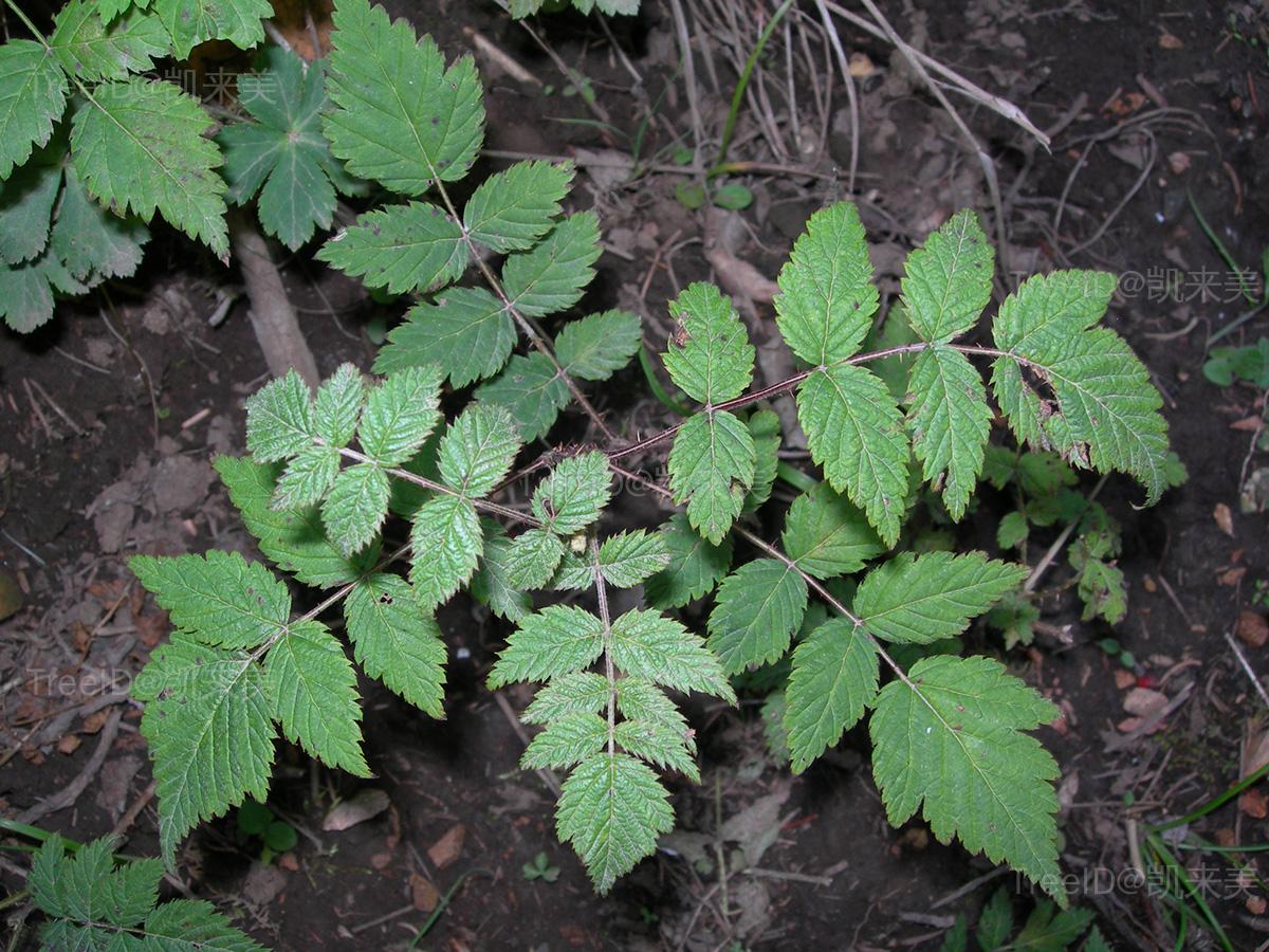 羽状复叶具小叶7-11,卵形,边缘有缺刻状重锯齿。花单生,白色,下垂;花梗有小钩刺。聚合果短圆柱形,桔红色。