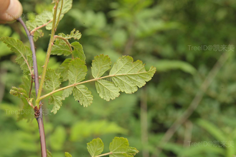 羽状复叶具小叶7-11枚,卵形,两面均具柔毛,边缘具深裂缺刻状重锯齿,顶生小叶有时羽状分裂。花1-3朵,顶生;花瓣长圆形。果实近球形,黑红色,密被毛。