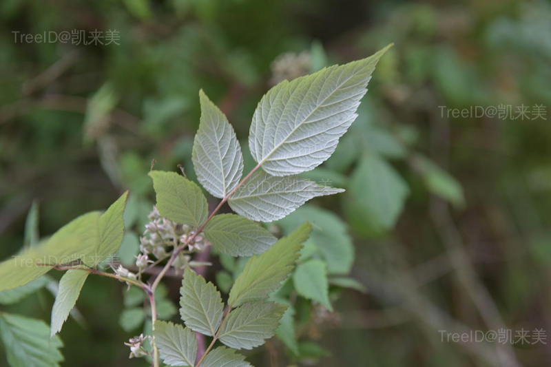 小叶3-5枚,卵形,下面密被白色绒毛,边缘常羽状浅裂,有缺刻状粗重锯齿。伞房花序有花5-15朵;花瓣浅红色,近圆形。果实近球形,密被白色短绒毛。